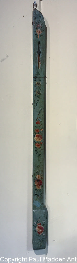 Antique 18th C. French portable mercury barometer. Original painted decorated surface. Adjustable register scale for altitude compensation. Unique folding case design for portability. Measures 38" high. Replaced (custom made) glass tube. Good working and overall condition.