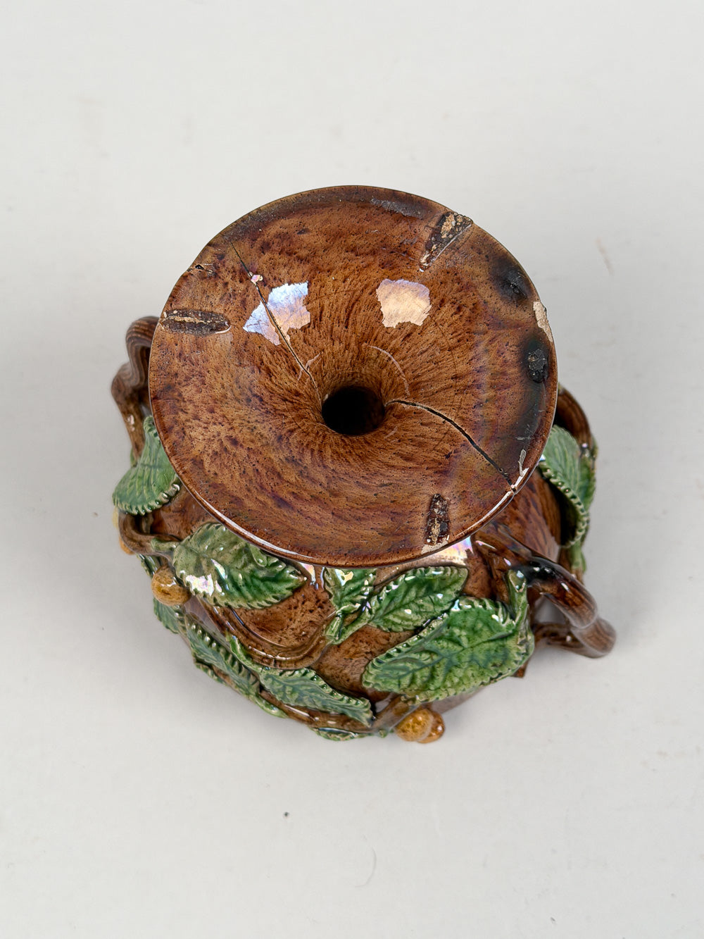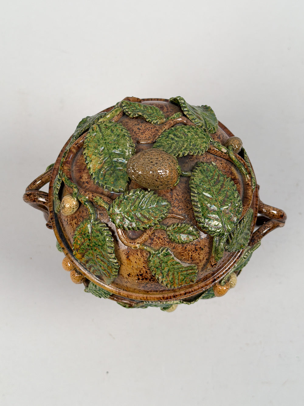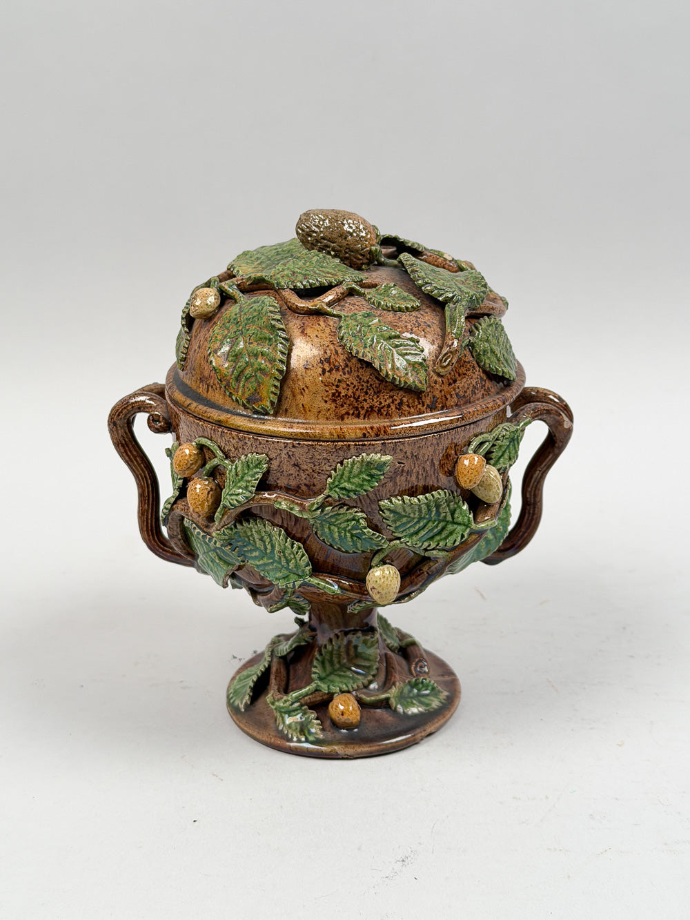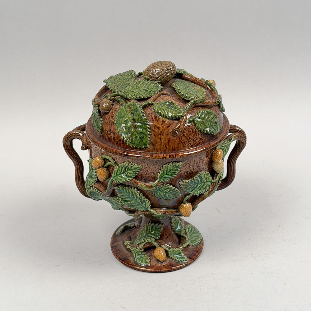SKU:PHMMPWTAntique 19th C. majolica Palissy ware tureen with lid. Features naturalistic molded decoration of leaves, branches, and acorns. Two small chips under base and on handle, otherwise great condition. Measures 7" high by 6" wide.