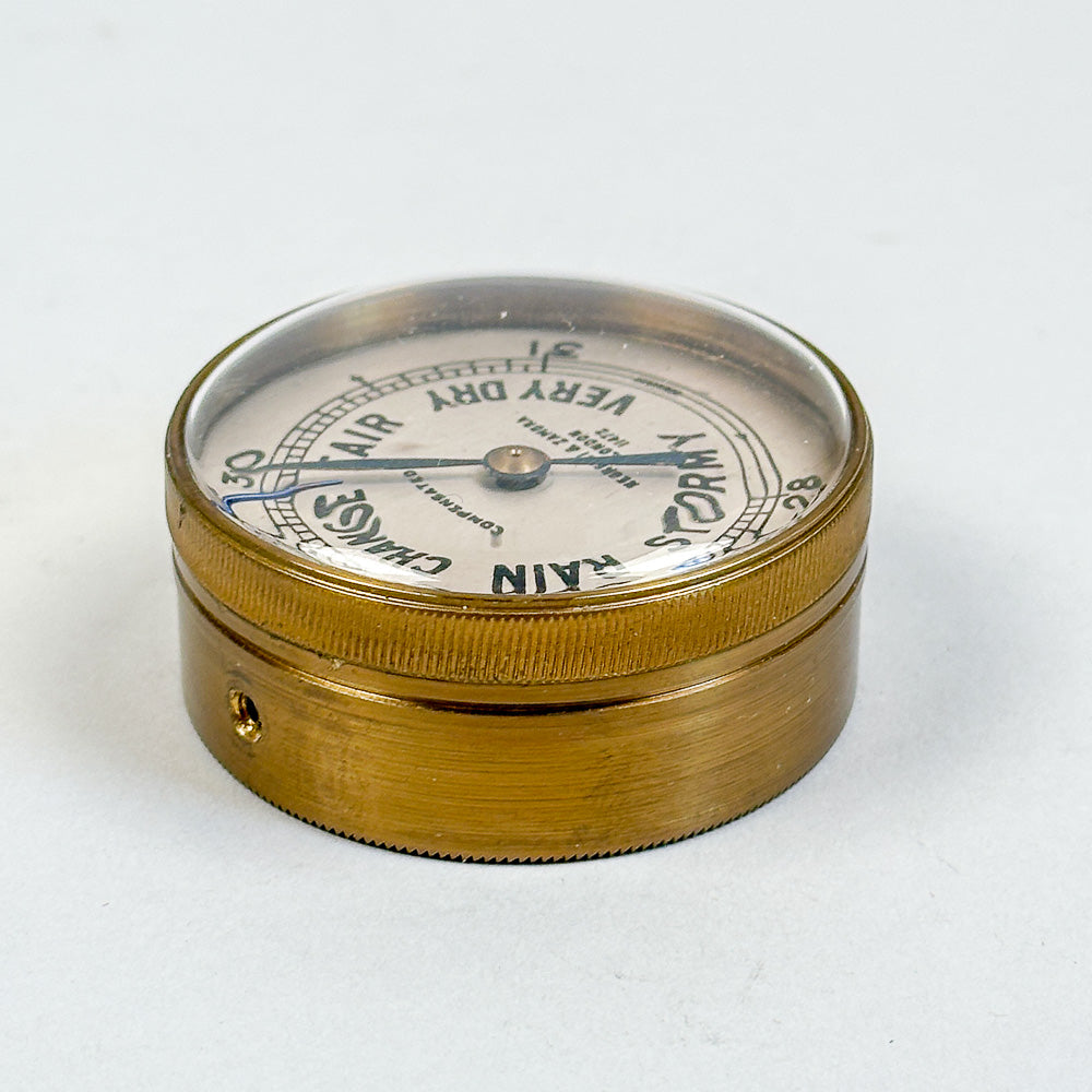 SKU:PMA250611Antique English pocket aneroid barometer in case by Negretti & Zambra, London circa 1900. Brass case with rotating bezel measures just 2" diameter. Missing top ring, otherwise great working and overall condition.