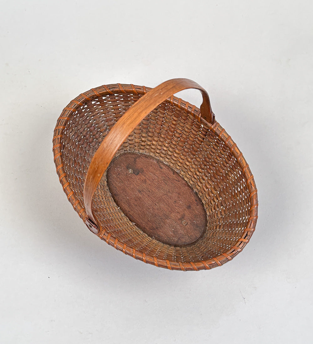 SKU:PHM237Antique Nantucket oval swing handled basket, circa 1870. A small open oval cane woven basket with canted rattan staves, carved swing handle with slight lozenge ends mounted on rectangular wooden ears extending down a quarter stave length, hardwood bottom, unsigned. Exceptionally rare and attractive style of deeply flared sides makes this one well above the average. Great condition, quality, and color. Measures 3" x 8-1/8" x 5-¾"