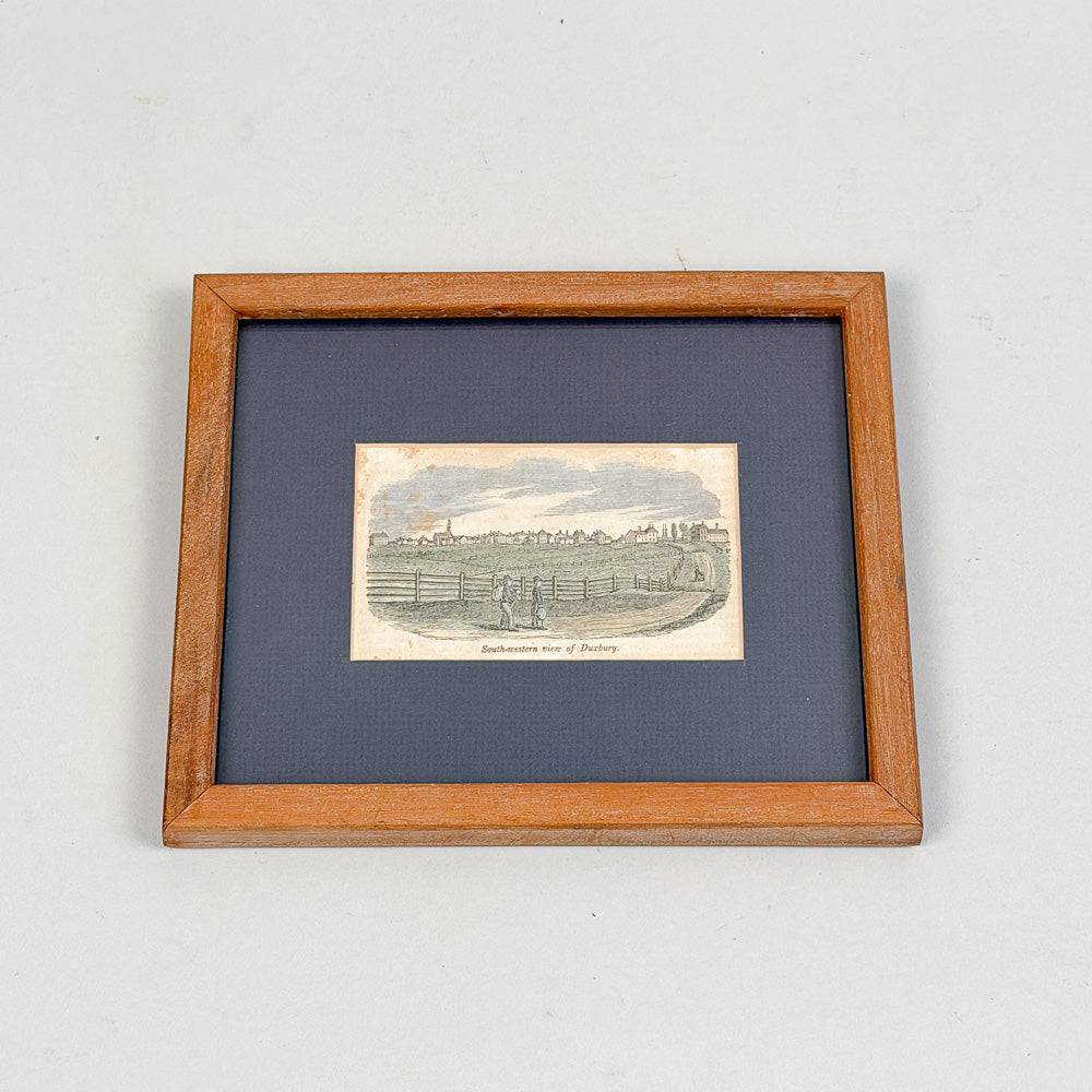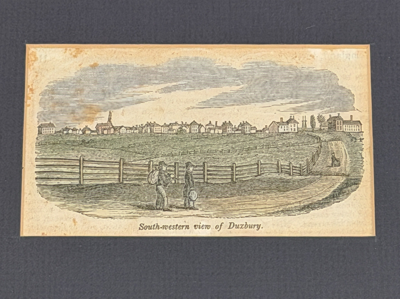 A charming antique print titled "South-western view of Duxbury". Matted and framed under glass. Good condition, measures 7-1/2" by 6-1/4" overall framed.