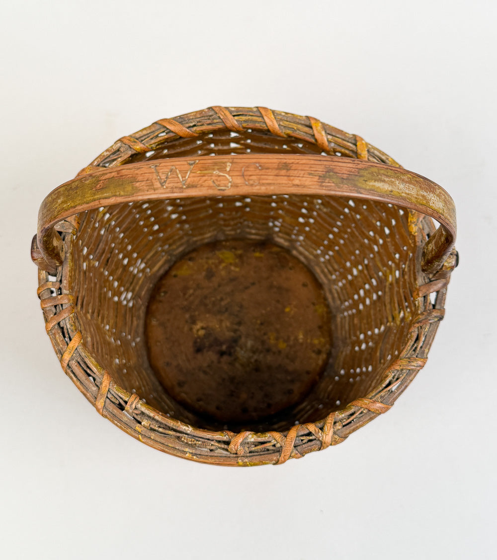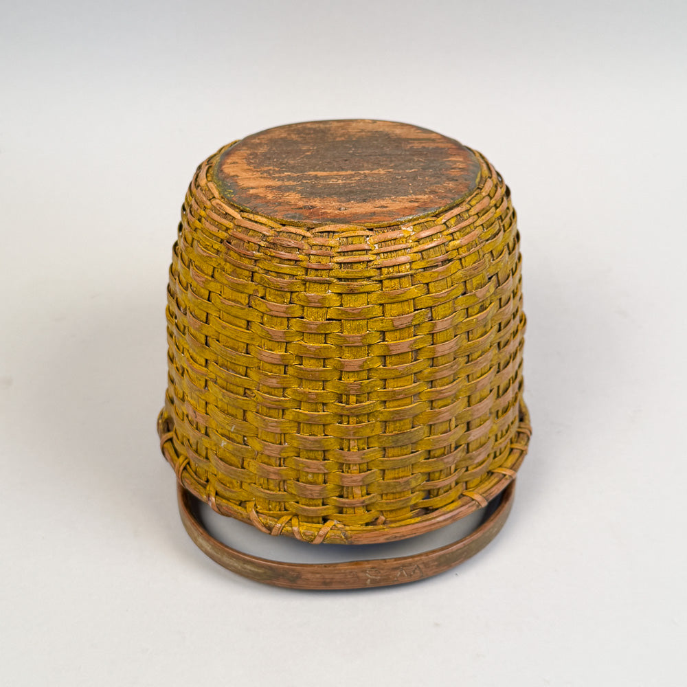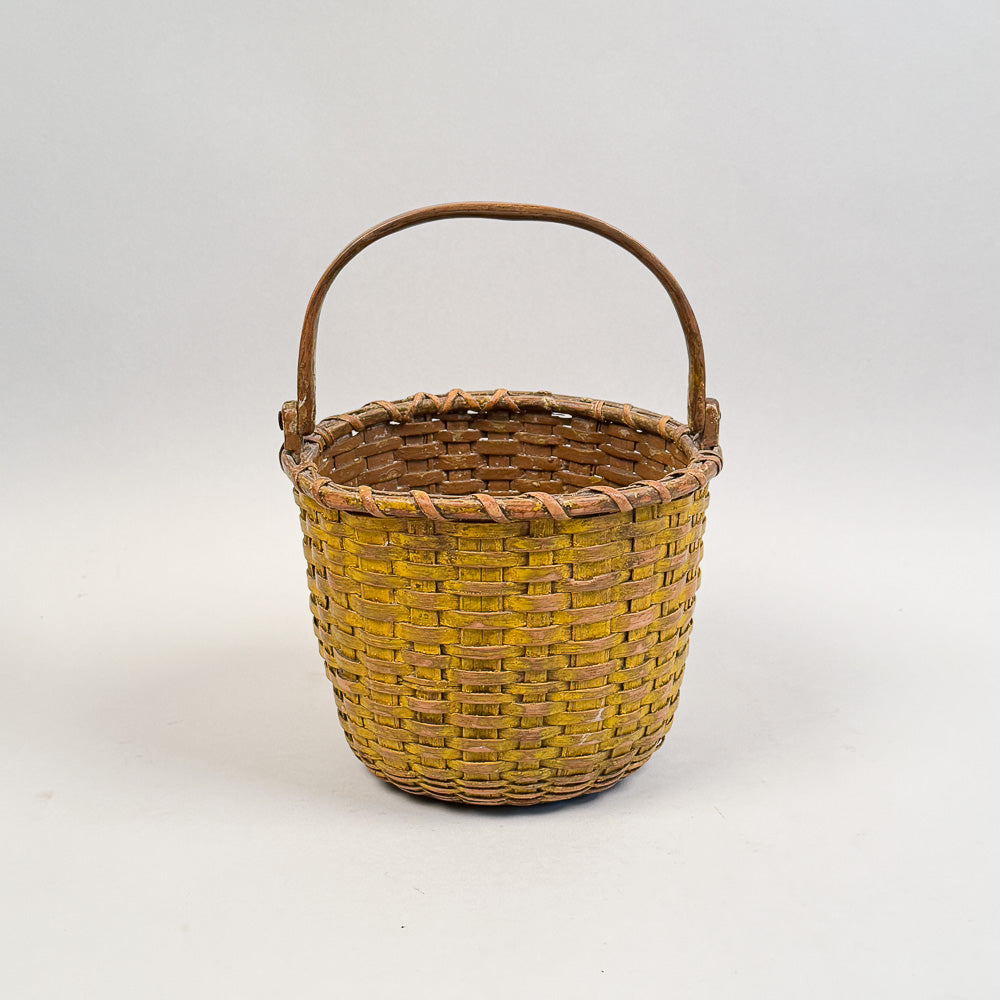 SKU:PHM245Antique Nantucket basket with swing handle and yellow paint circa 1850. 19th C. Nantucket baskets with paint are very rare and this one has a great yellow washed color in original condition. Furthermore, this basket features both splint wood and rattan as the weavers. The thinner rattan being used near the bottom bend where it meets the wooden base. Measures 6-3/4" diameter by 5-1/2" high.