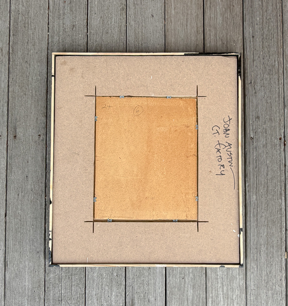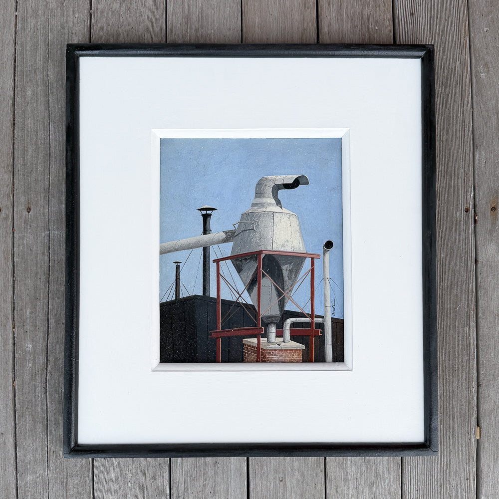 SKU:PMA32190FConnecticut Factory Rooftop egg tempera painting by John Austin (1918-2001). Depicts an industrial factory rooftop in CT. An early example of Austin's work (before he moved to Nantucket) with his typical composition, perspective, and color palette. Framed in black / white wood frame. Measures 18-1/2" by 16-1/2" overall framed.