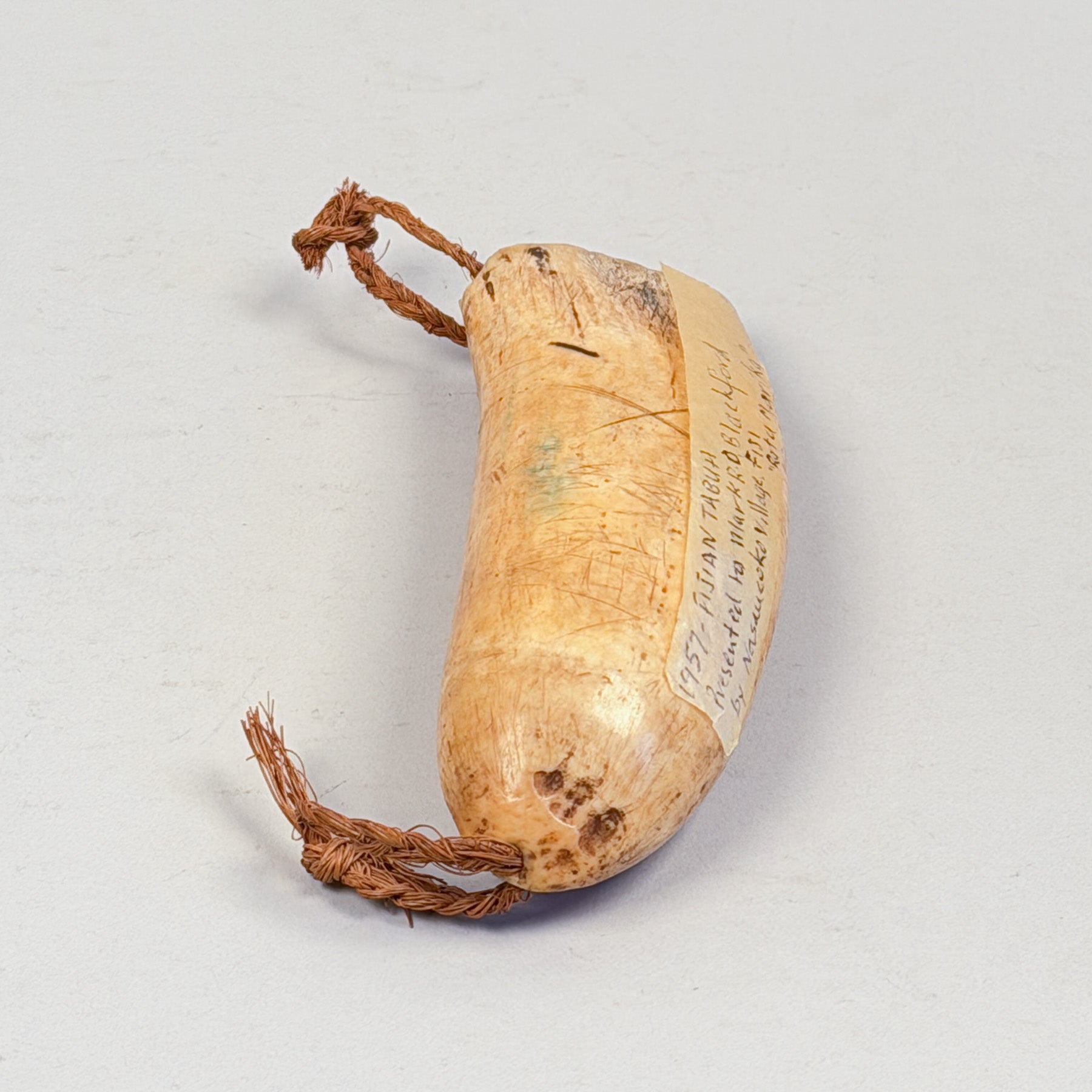 SKU:PMA32212Vintage sperm whale Tabua necklace from Fiji circa 1950. Retains necklace loops and is inscribed with tribal markings. Includes a note "Presented to Mark R.O. Blackford by Nasaucoko Village. Fiji" Further noted "Ratu Marika" which refers to the Fijian chief/senator Marika Latianara (1913–1983). Measures 6" long.