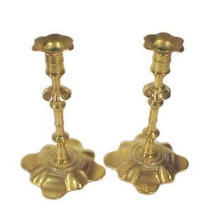 SKU:pma24070A superbly made pair ofQueen Anne style brass candlestick with petal base circa 1860. Excellent condition. Size 8 inches tall.