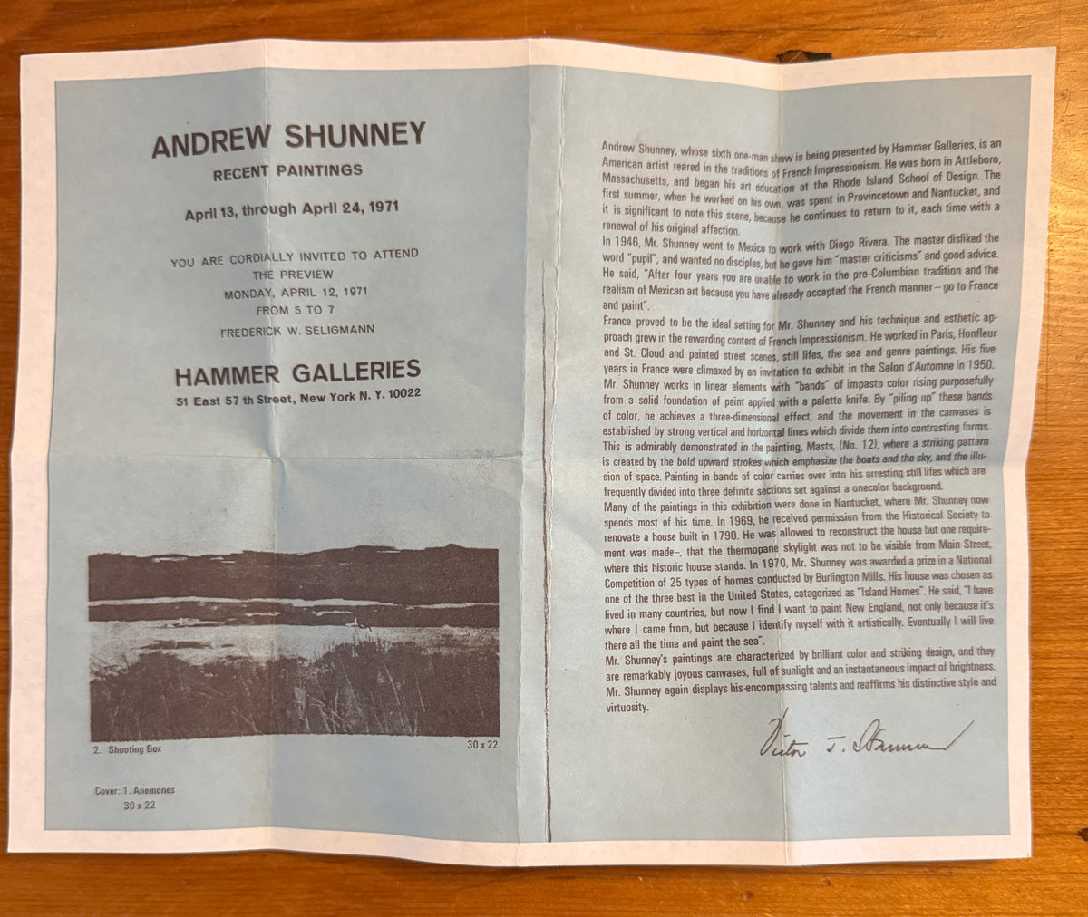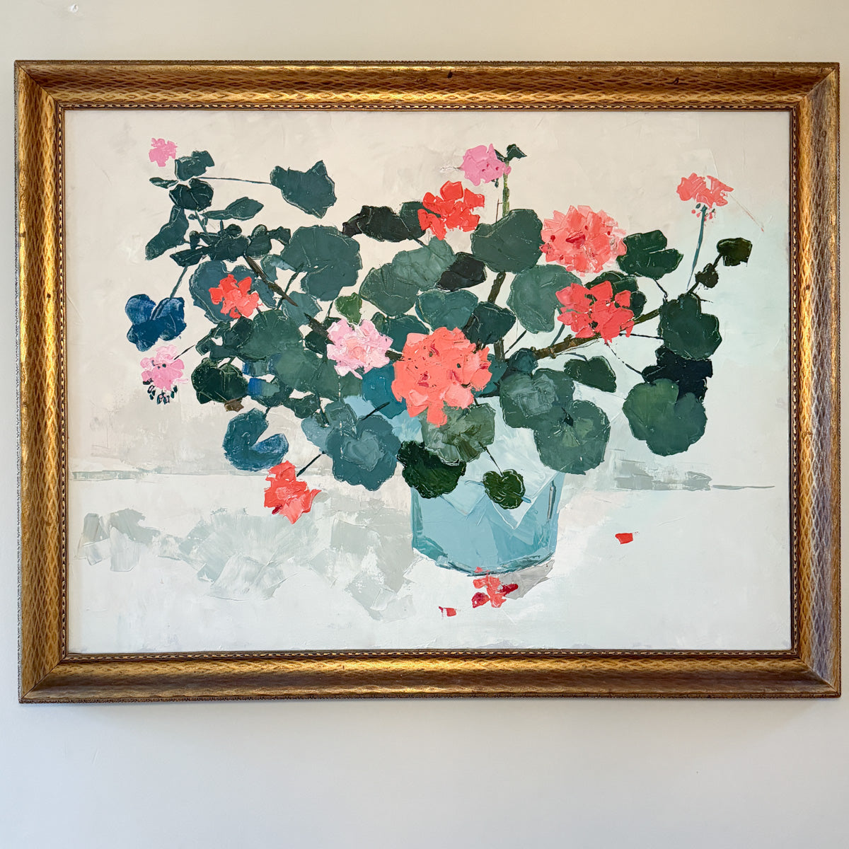 SKU:PMA32167gA large acrylic painting "Potted Geraniums" by Andrew Shunney (1916-1978). His last work and fitting that it was an old geranium, one of his favorite subject matters. Great use of thick layered impasto style in a minimalist abstract design. Ex. collection of Carole Webster. Measures 5" x 45" overall framed.
