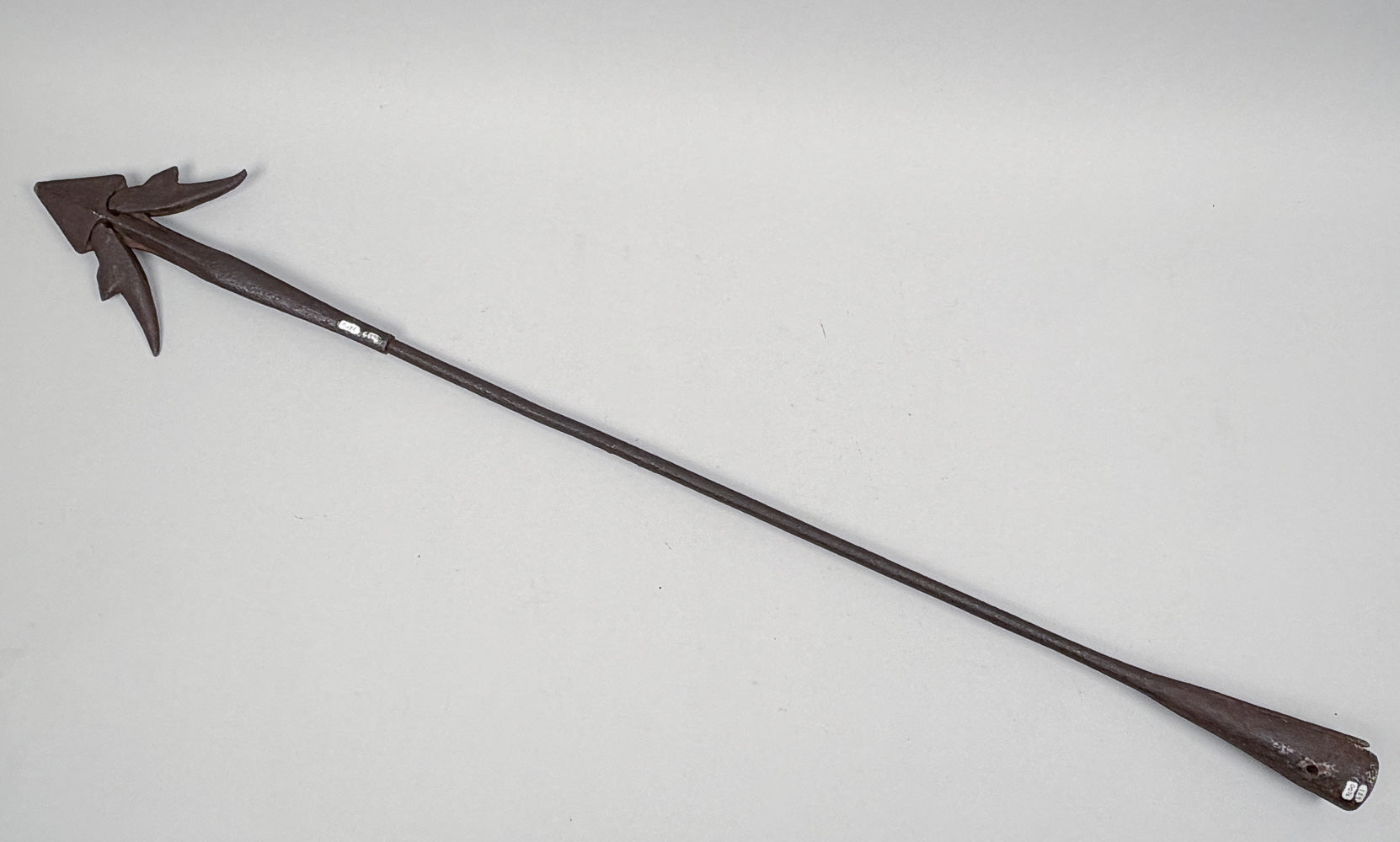 The tip is blunted – possibly slightly broken away and one barb is bent slightly and also minimally broken at its pointed end. The head is moderately pitted overall, as is the shank and socket, and both pieces have a deep brown patina and match each other perfectly. Overall length: 34".