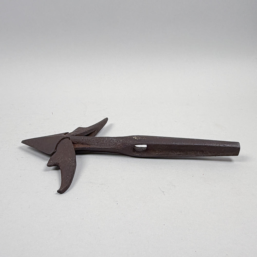 Consists of a detachable head and socket with two moveable flukes which fits onto a standard harpoon shank and socket. The detachable head is 9-11/16" long. The movable flukes are 6-15/16" apart when fully opened, and 2-7/8" when closed. Ahead of the flukes the point is a triangle with 2-1/8" long sharpened sides and a strong central keel on each side.