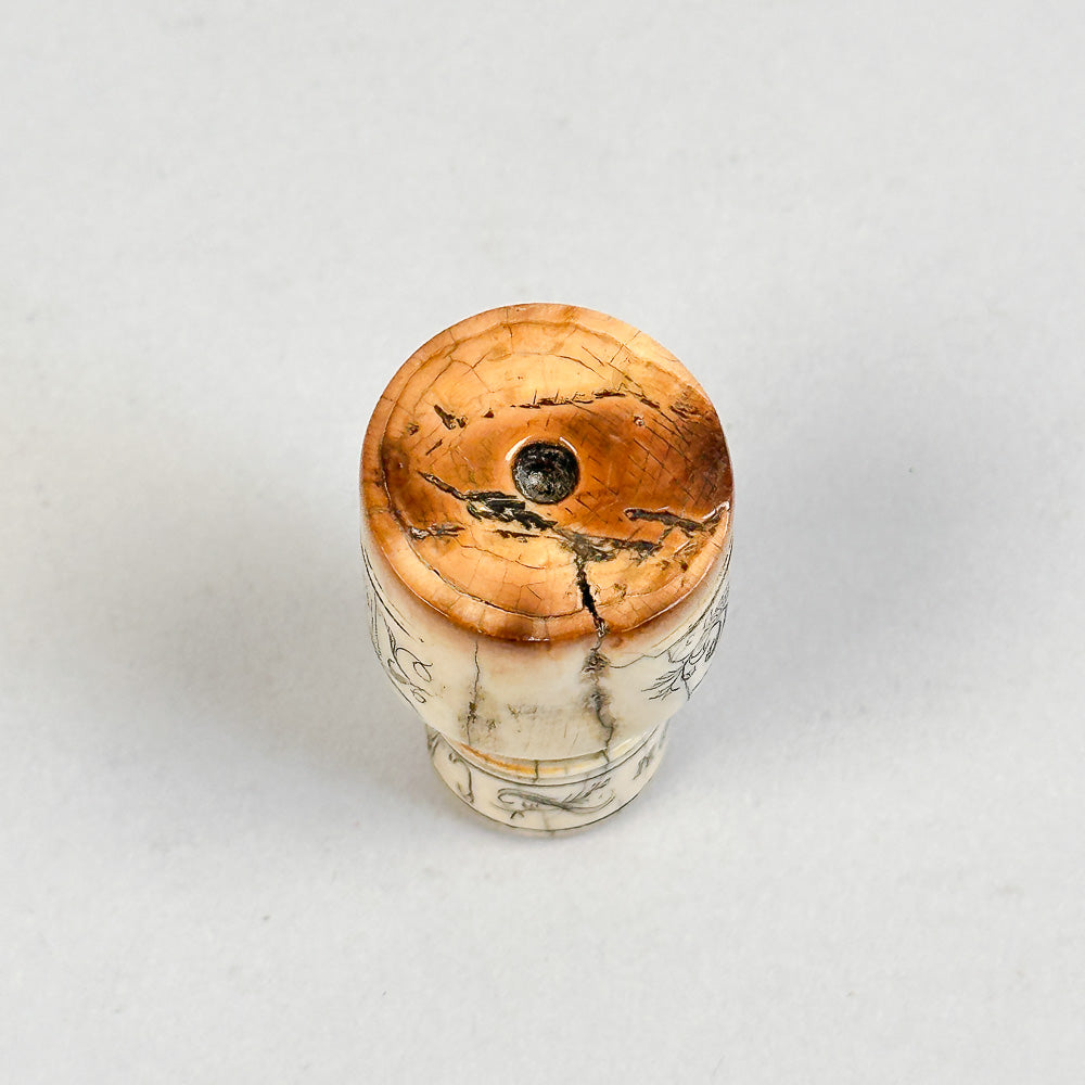 SKU:PMA32146BA rare antique scrimshaw whale ivory logbook stamp circa 1850. Marked with the name "Capt. Oze Gendron", "Sperm" for the type of stamp, and "Eliza A" for the ship. Further scrimshawed with two signal flags, edging, and decorative motifs. A compact Sperm whale (with hole to indicated barrels rendered) is carved in relief to make the stamping surface. Measures 15/16" diameter by 1-5/8" tall.