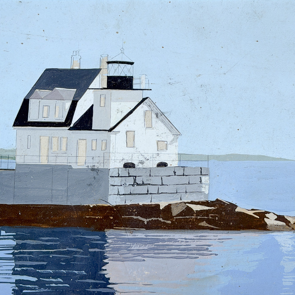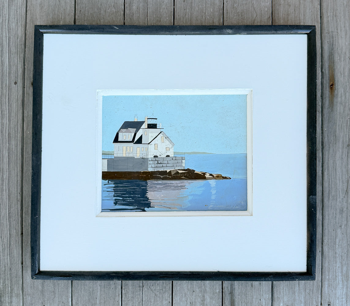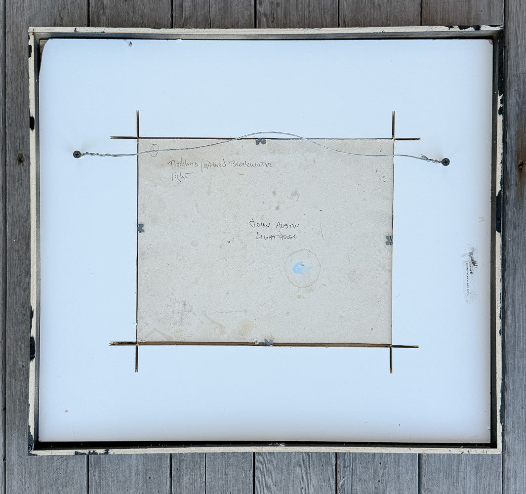SKU:PMA32174ERockland (Maine) Breakwater Light egg tempera painting on board by Nantucket artist John Austin (1918-2001). Depicts the lighthouse at the end of the breakwater in Rockland Maine. Great composition, perspective, and color palette in a typical John Austin painting. Framed in black / white wood frame. Measures 17-1/2" by 19-1/2" overall.