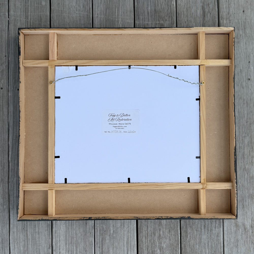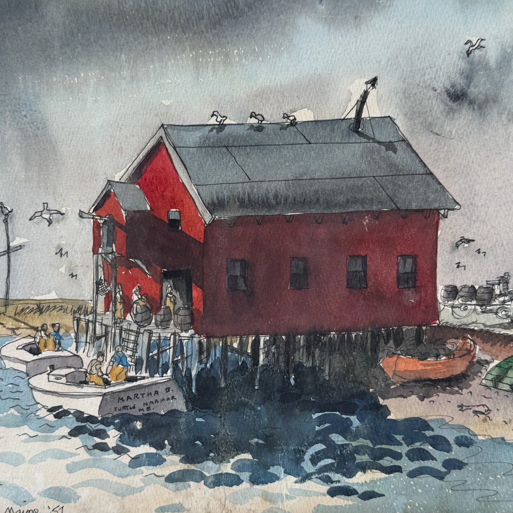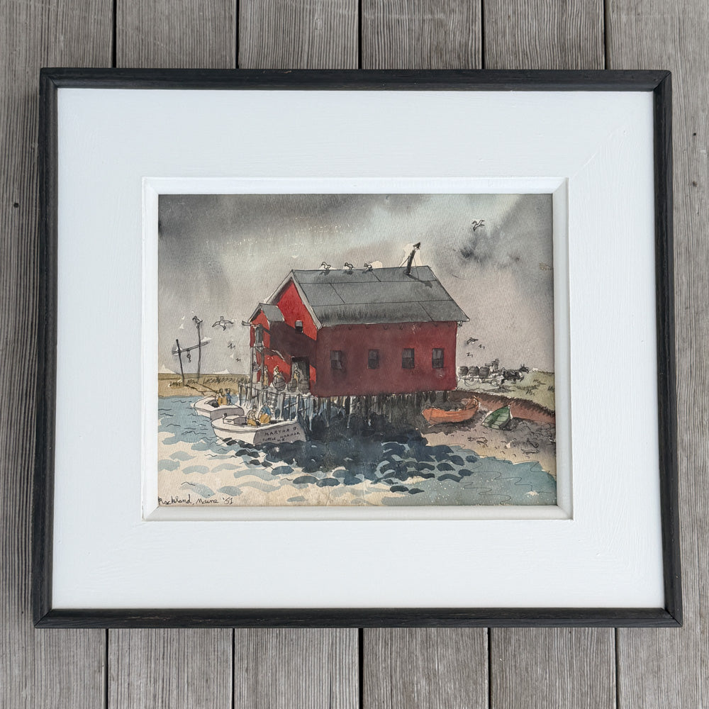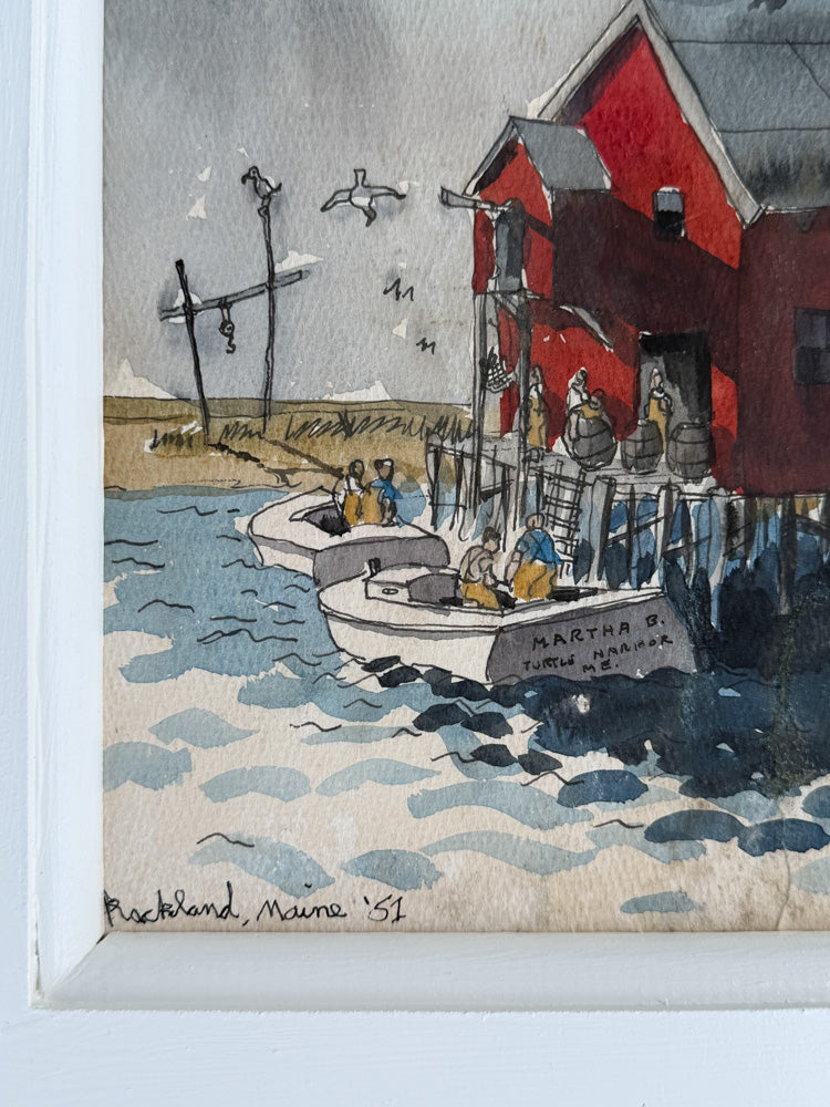 SKU:PMA251215Rockland Maine Boathouse watercolor by John Austin dated 1951. An early work of Austin's before he was primarily working with egg tempera. Displays a nice illustrative feel while the subject shows his lifelong interest of people working with the sea. Framed in black / white wood frame. Measures 17" by 15" overall framed.