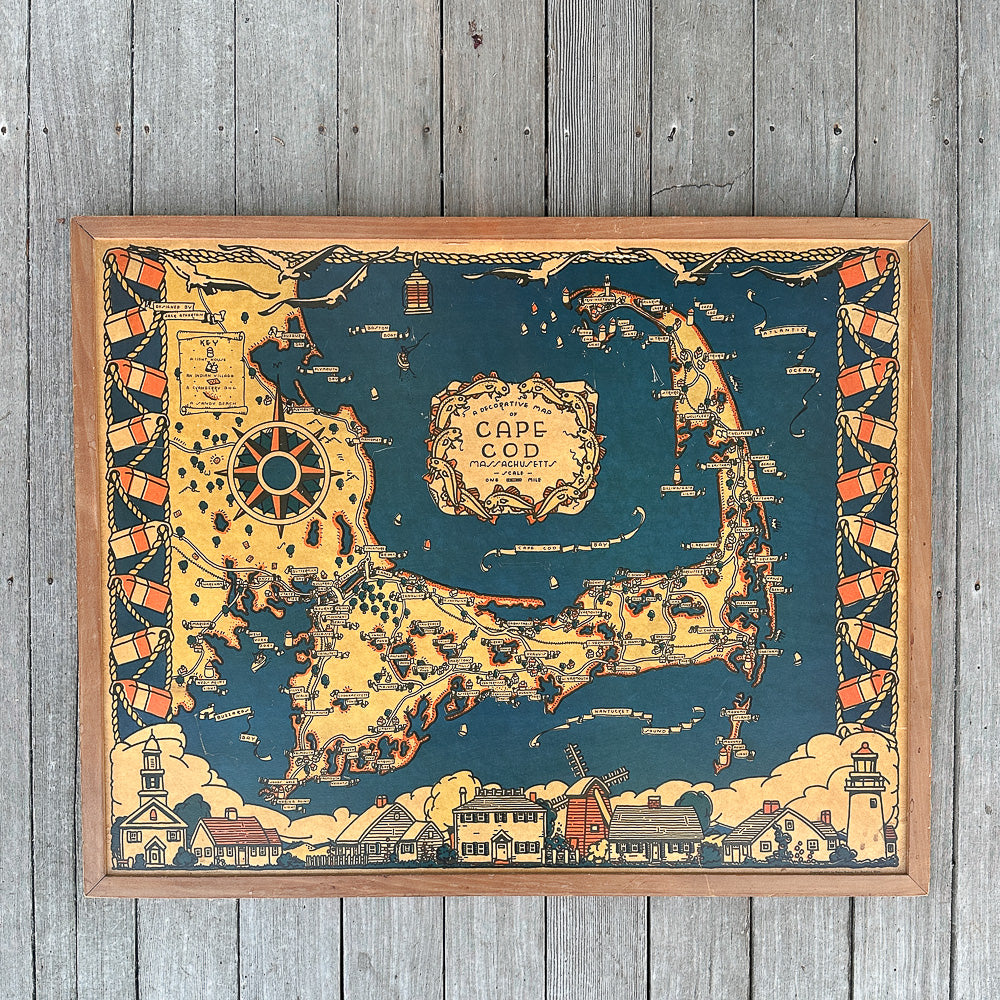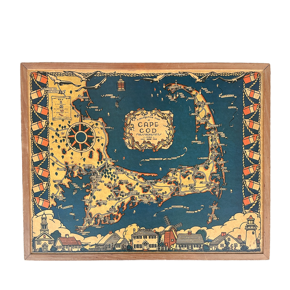 SKU:PMA241222aVintage pictorial map of Cape Cod by Jack Atherton. Great colors and many points of Cape Cod interest to be found. Decorative border of buoys, buildings, and seagulls. Original frame. Great condition. Measures 30" x 23".