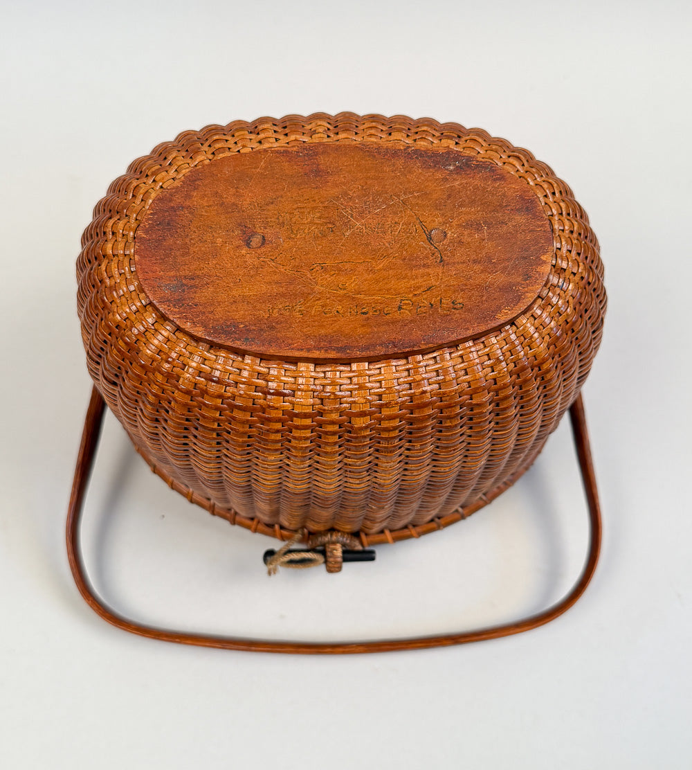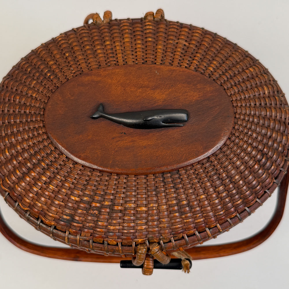 SKU:PMA32170An early Nantucket basket purse by José Formoso Reyes (1902-1980) circa 1955. Made from a 8-1/4" by 6-1/2" oval mold and measures 9-1/4" wide overall. Features an ebony carved Sperm whale ornament and peg. Hinges, clasp, and a few weavers professionally restored. Great condition with a rich patina.