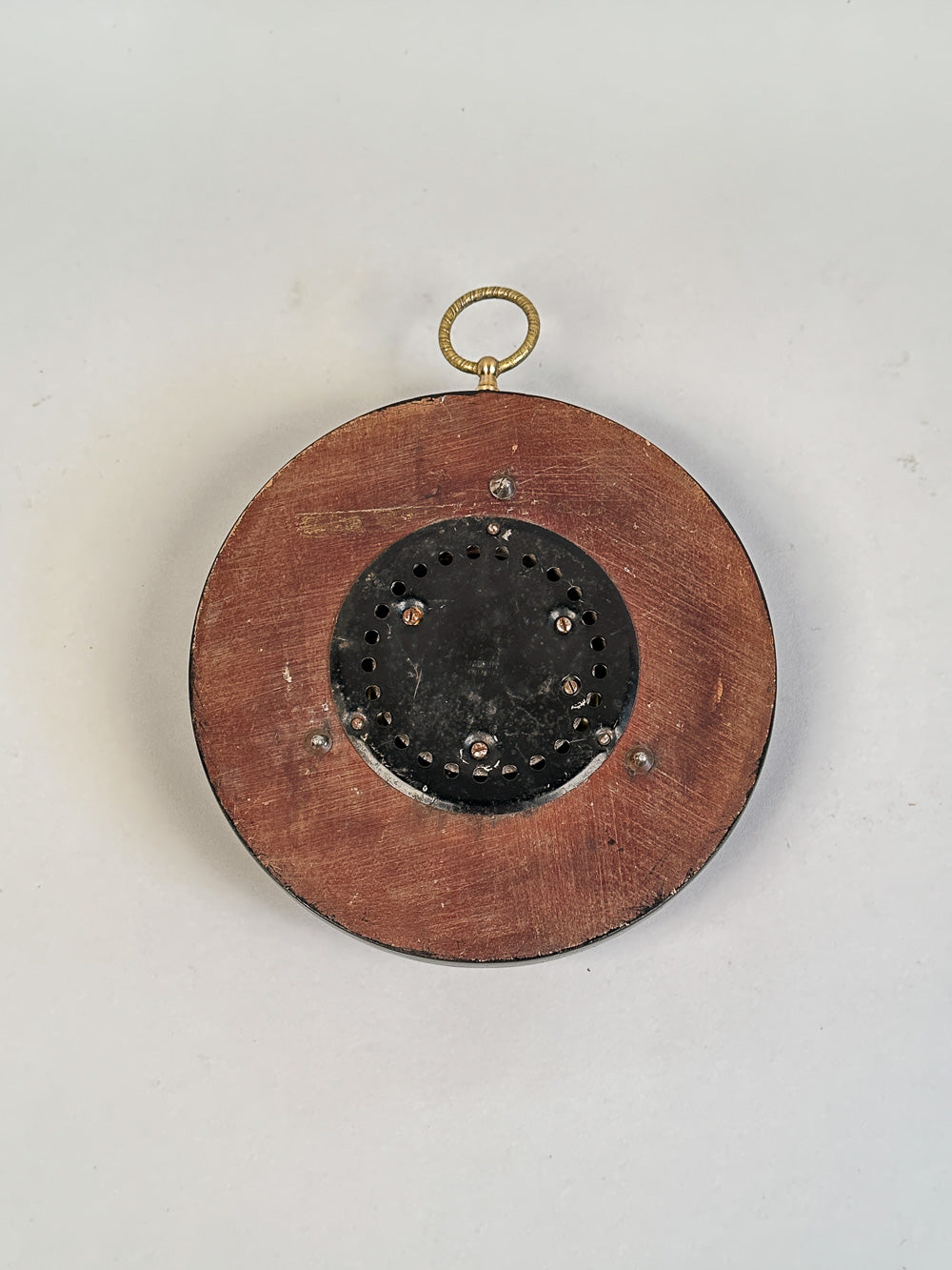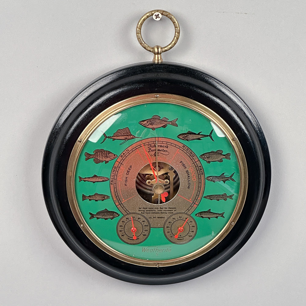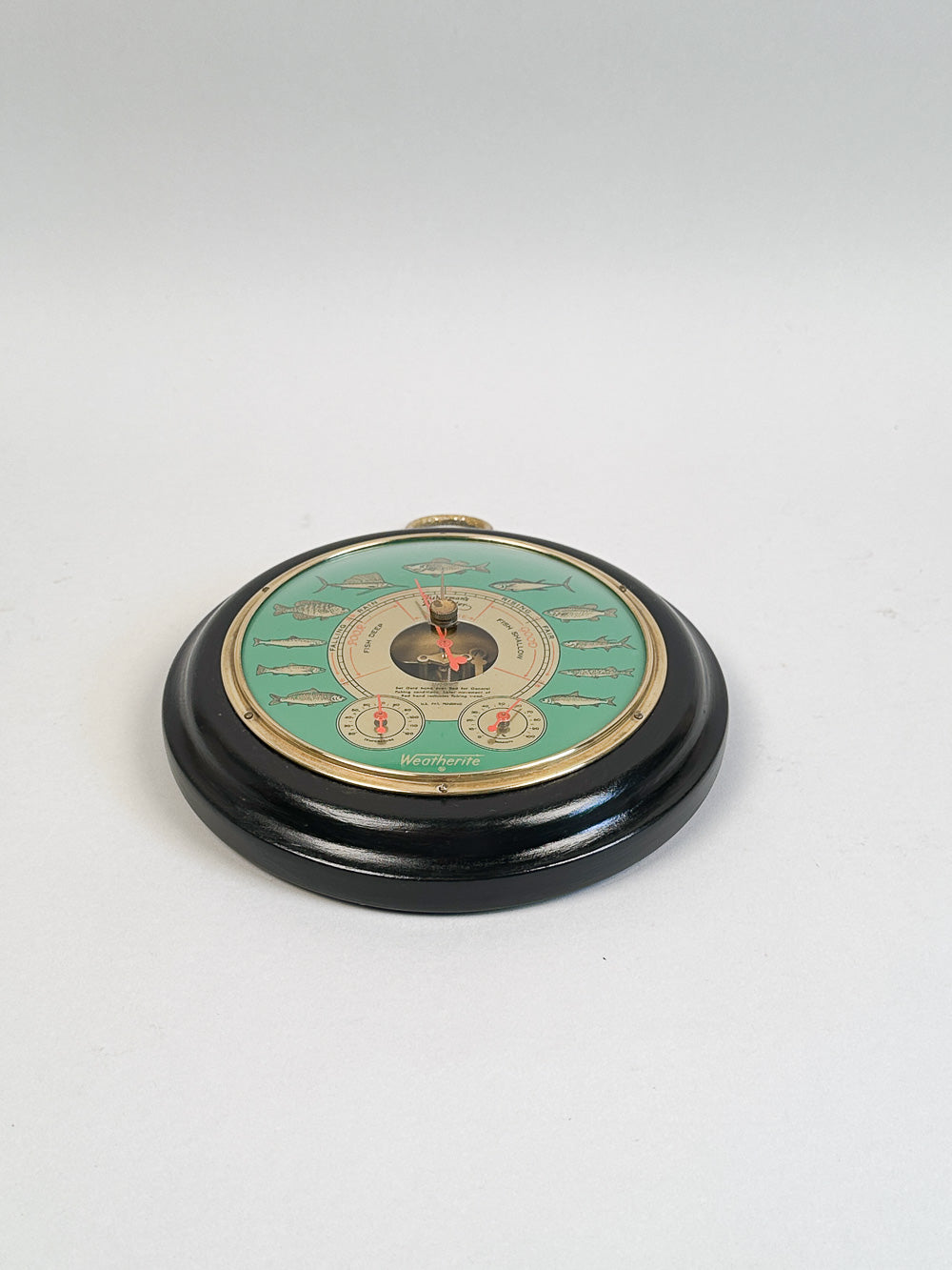 SKU:PMA241125Vintage Weatherite aneroid Fisherman's barometer made in Germany circa 1930. Nice large display featuring various fish and a fishing rod for a indicator hand, thermometer, and hygrometer. Great working and overall condition. Measures 7-1/4" diameter.